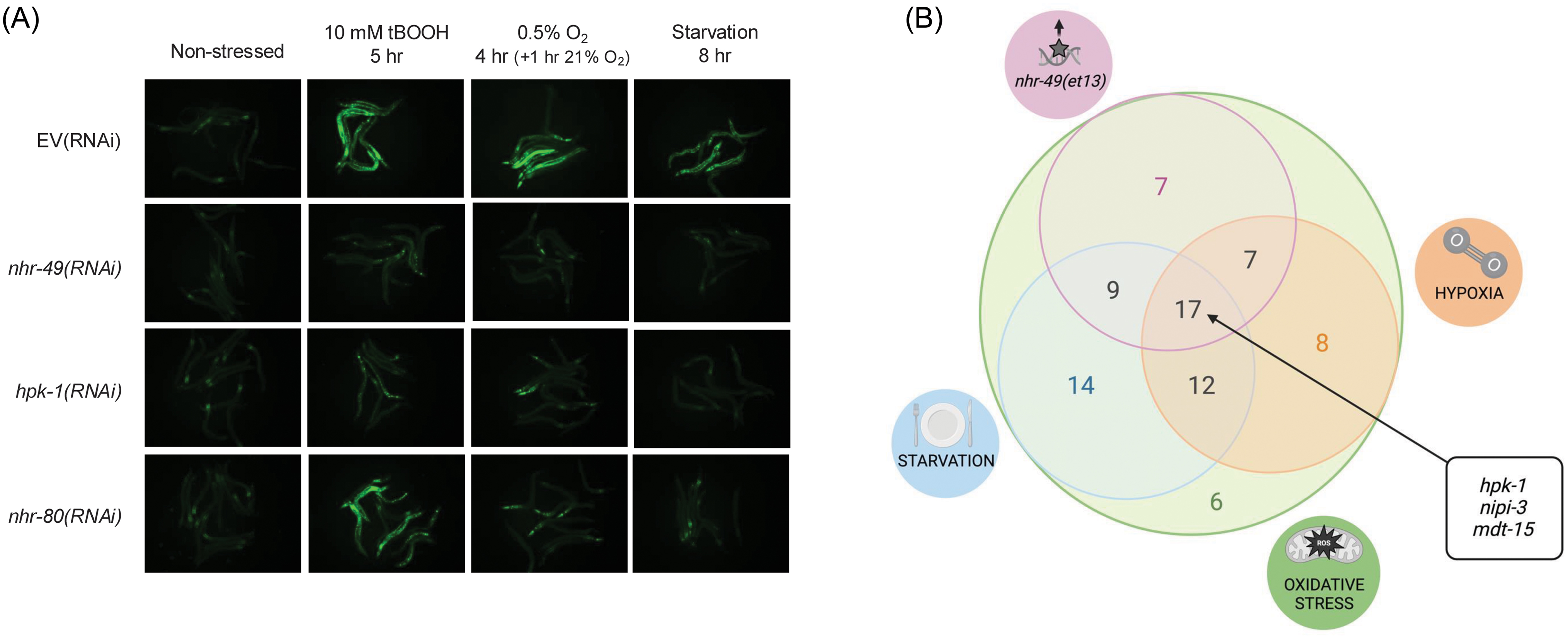(A) Representative micrographs of fmo-2p::gfp adult animals fed empty vector (EV) or nhr-49 RNAi (negative and positive controls, respectively) or RNAi of hpk-1 (screen hit) or nhr-80 in non-stressed conditions, after 5 hours exposure to 10 mM tBOOH, after 4 hours exposure to 0.5% O2 followed by 1 hour recovery in 21% O2, and after 8 hours without food. (B) The Venn diagram shows the overlap of hits from RNAi screens for genes required to induce fmo-2p::gfp in oxidative stress, hypoxia, starvation, or in the nhr-49(et13) background (see Supplementary Table 1G for gene lists). Three genes that were hits in all screens are highlighted: mdt-15, a known nhr-49 coregulator32,41, and hpk-1 and nipi-3, which were further investigated in this study.