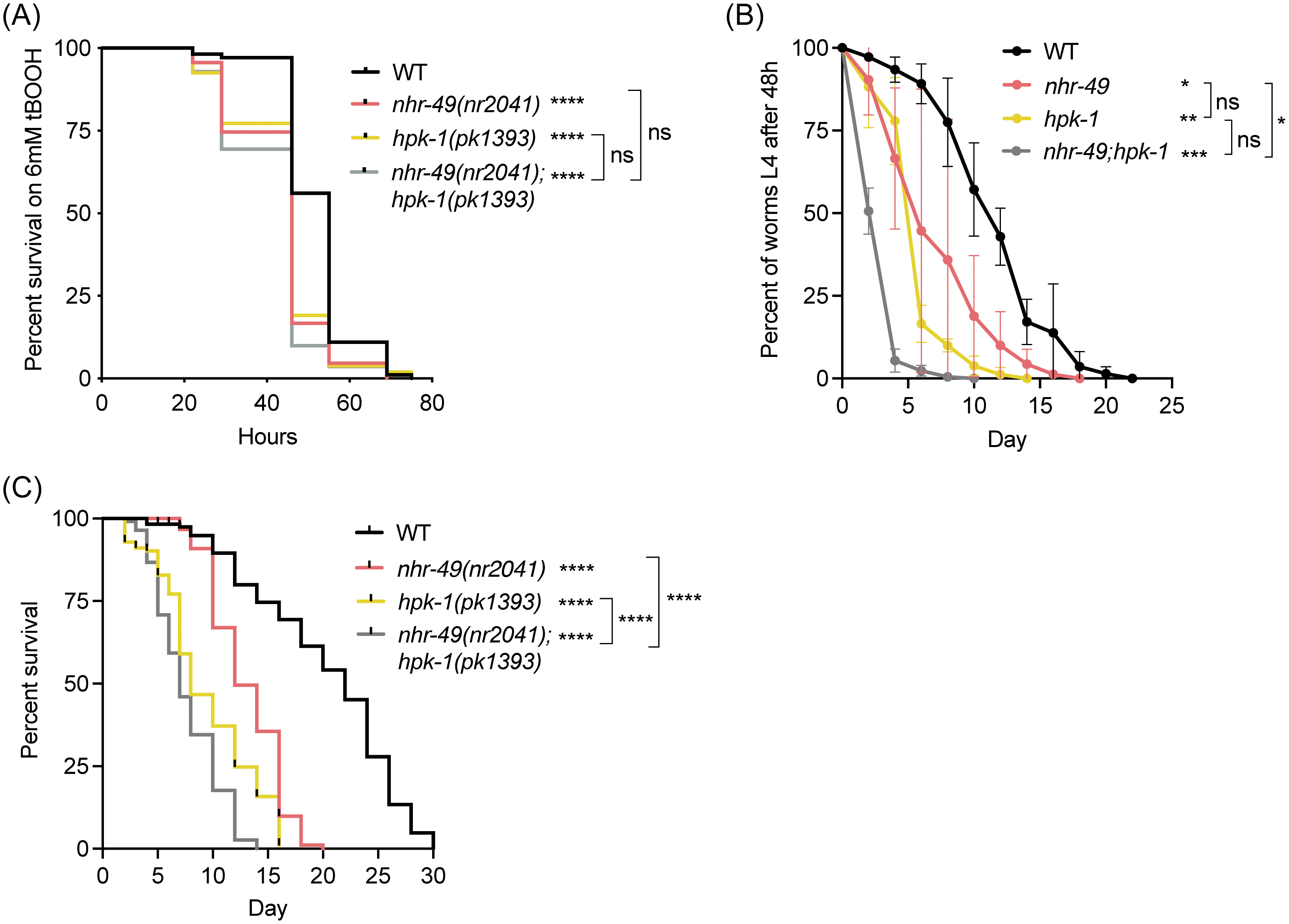 (A) Survival plot of wild-type, nhr-49(nr2041), hpk-1(pk1393), and nhr-49(nr2041);hpk-1(pk1393) L4 animals exposed to 6 mM tBOOH. p-values were derived using the log-rank (Mantel-Cox) test. ****p < 0.0001 versus wild-type animals; ns versus nhr-49(nr2041);hpk-1(pk1393). Data and statistical analysis for additional repeats in Supplementary Table 2. (B) Fractional population recovery to L4 after L1 starvation (in percent, y-axis) over time (days of starvation, x-axis) of wild-type, nhr-49(nr2041), hpk-1(pk1393), and nhr-49(nr2041);hpk-1(pk1393) animals. Error bars represent SD from at least three independent experiments. p-values were derived by calculating area under the curve (AUC) for each strain using one-way ANOVA with Dunnett’s multiple comparisons test. *p < 0.05, **p < 0.01, ***p < 0.001 (n = 3, >100 animals per time point, normalized to 100% viability for each strain). (C) Lifespan of wild-type, nhr-49(nr2041), hpk-1(pk1393), and nhr-49(nr2041);hpk-1(pk1393) animals. p-values were derived using the log-rank (Mantel-Cox) test. ****p < 0.0001. Data and statistical analysis for additional repeats in Supplementary Table 3. ns = not significant.