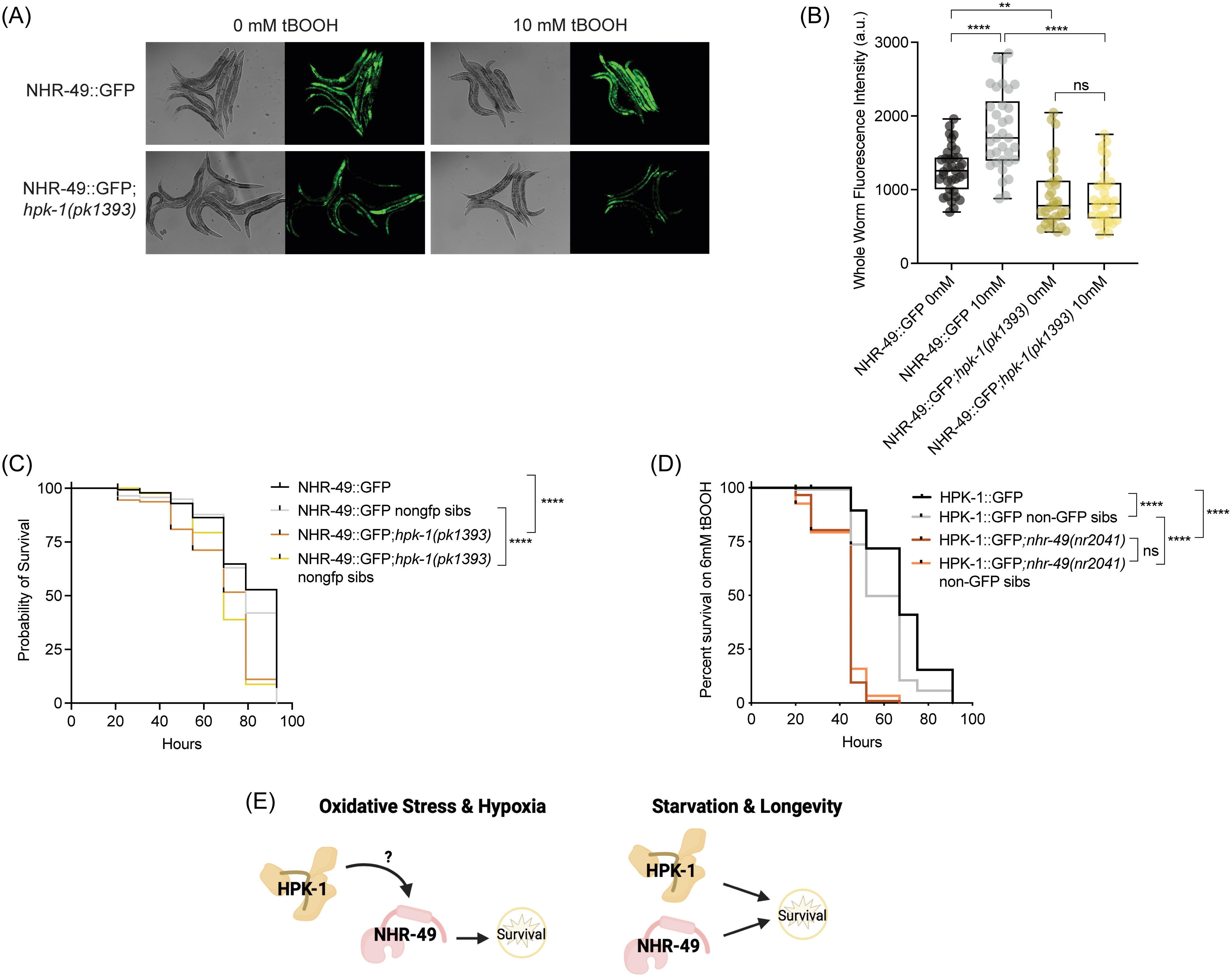 (A) Representative micrographs show nhr-49p::nhr-49::gfp and nhr-49p::nhr-49::gfp;hpk-1(pk1393) adult animals following 3 hours exposure to 10 mM tBOOH. (B) The graph shows the quantification of whole animal GFP levels in nhr-49p::nhr-49::gfp and nhr-49p::nhr-49::gfp;hpk-1(pk1393) animals following 3 hours exposure 10 mM tBOOH (three repeats totaling > 30 individual animals per strain). **p < 0.01, ***p < 0.001 (two-way ANOVA corrected for multiple comparisons using the Tukey method). (C) Survival plot of nhr-49p::nhr-49::gfp and nhr-49p::nhr-49::gfp;hpk-1(pk1393) and non-GFP sibling L4 animals exposed to 6 mM tBOOH. p-values were derived using the log-rank (Mantel-Cox) test. ****p < 0.0001. Data and statistical analysis for additional repeats in Supplementary Table 4. (D) Survival plot of hpk-1p::hpk-1::gfp and hpk-1p::hpk1::gfp;nhr-49(nr2041) and non-GFP sibling L4 animals exposed to 6 mM tBOOH. p-values were derived using the log-rank (Mantel-Cox) test. ****p < 0.0001. Data and statistical analysis for additional repeats in Supplementary Table 5. (E) Working model of how NHR-49 and HPK-1 interact in response to oxidative stress, hypoxia, starvation, and for promotion of normal lifespan. ns = not significant.
