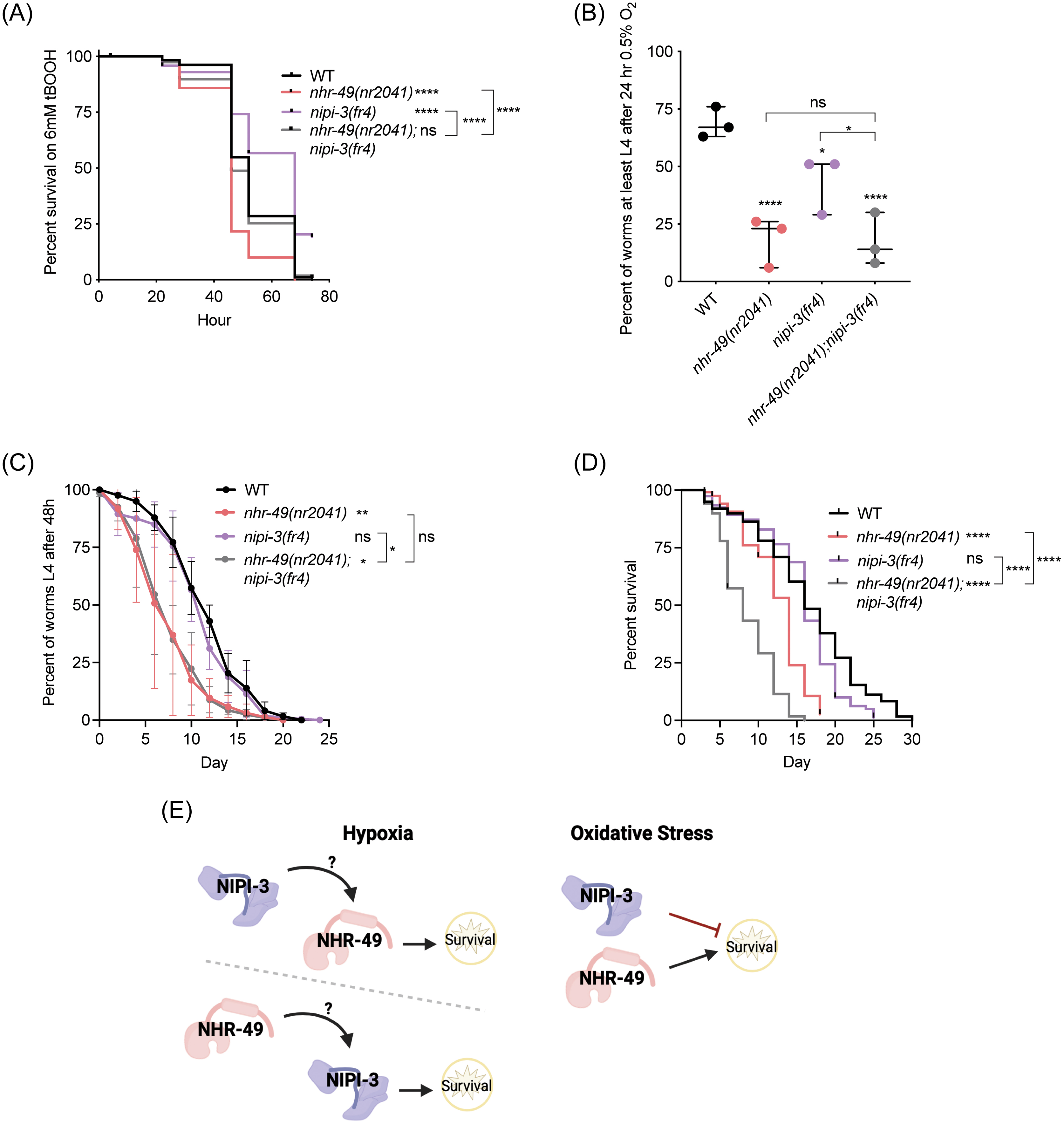 (A) The graph shows population survival of wild-type, nhr-49(nr2041), nipi-3(fr4), and nhr-49(nr2041);nipi-3(fr4) L4 stage animals exposed to 6 mM tBOOH. p-values were derived using the log-rank (Mantel-Cox) test. ****p < 0.0001. Data and statistical analysis for additional repeats in Supplementary Table 6. (B) The graph shows the average population survival of wild-type, nhr-49(nr2041), nipi-3(fr4), and nhr-49(nr2041);nipi-3(fr4) embryos following 24 hours exposure to 0.5% O2, then allowed to recover at 21% O2 for 65 hours, and counted as the ability to reach at least L4 stage (n = 4, totaling > 100 individual animals per strain). p-values were derived using ordinary one-way ANOVA corrected for multiple comparisons using the Tukey method. *p < 0.05, ****p < 0.0001. (C) Fractional population recovery to L4 after L1 starvation (in percent, y-axis) over time (days of starvation, x-axis) of wild-type, nhr-49(nr2041), nipi-3(fr4), and nhr-49(nr2041);nipi-3(fr4) animals. Error bars represent SD from at least three independent experiments. p-values were derived by calculating AUC for each strain using one-way ANOVA with Dunnett’s multiple comparisons test. *p < 0.05, **p < 0.01 (n = 4, >100 animals per time point, normalized to 100% viability for each strain). (D) Lifespans of wild-type, nhr-49(nr2041), nipi-3(fr4), and nhr-49(nr2041);nipi-3(fr4) animals. p-values were derived using the log-rank (Mantel-Cox) test. ****p < 0.0001. Data and statistical analysis for additional repeats in Supplementary Table 7. (E) Working model of how NHR-49 and NIPI-3 interact in response to oxidative stress and hypoxia. ns = not significant.